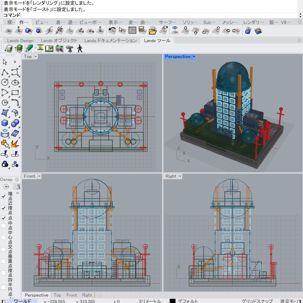 | 260408 | SF映画のバイオテクノロジー研究所 | なるべく生成AIの自由な発想に任せた | https://meet.studio3dx.com/scene/XpGWEYfG5C5jpdzcHDj4MGQDCm2Io7AvgB1C | Rhinoでモデリングをしましょう。SF映画に出てきそうなバイオテクノロジー研究所を作成してください。流線形を多用した、幾何学的なデザインでお願いします。複数のパーツに分けて、パーツごとに着色してマテリアル設定をお願いします。背景や照明は作業不要。 |
