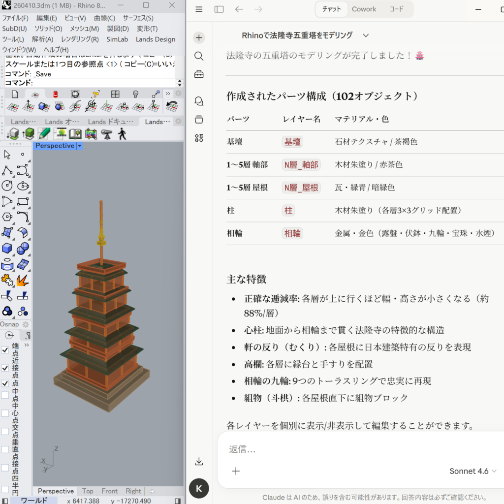 | 260410 | 法隆寺の五重塔を参考 | 現存する建物を指定して参考にさせた | https://meet.studio3dx.com/scene/OunObKcLqrWe7uloUKMjpEbsoOoKZHKNkkJN | Rhinoでモデリングをしましょう。精密な法隆寺の五重塔を作成してください。複数のパーツに分けて、パーツごとに着色してマテリアル設定をお願いします。背景や照明は作業不要。 |